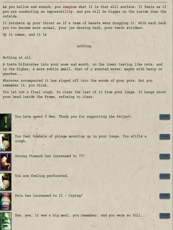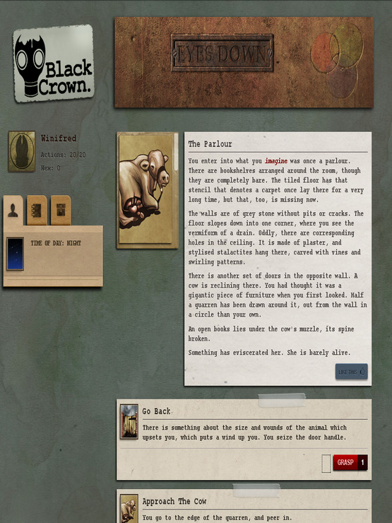 The Black Crown Project was a multimodal narrative horror game and featured interactive elements (known as miasmae) in a pseudo-3D environment. It was written by Dr. Rob Sherman of Bonfire Dog. The text of the original has been preserved in its entirety for Early Access.